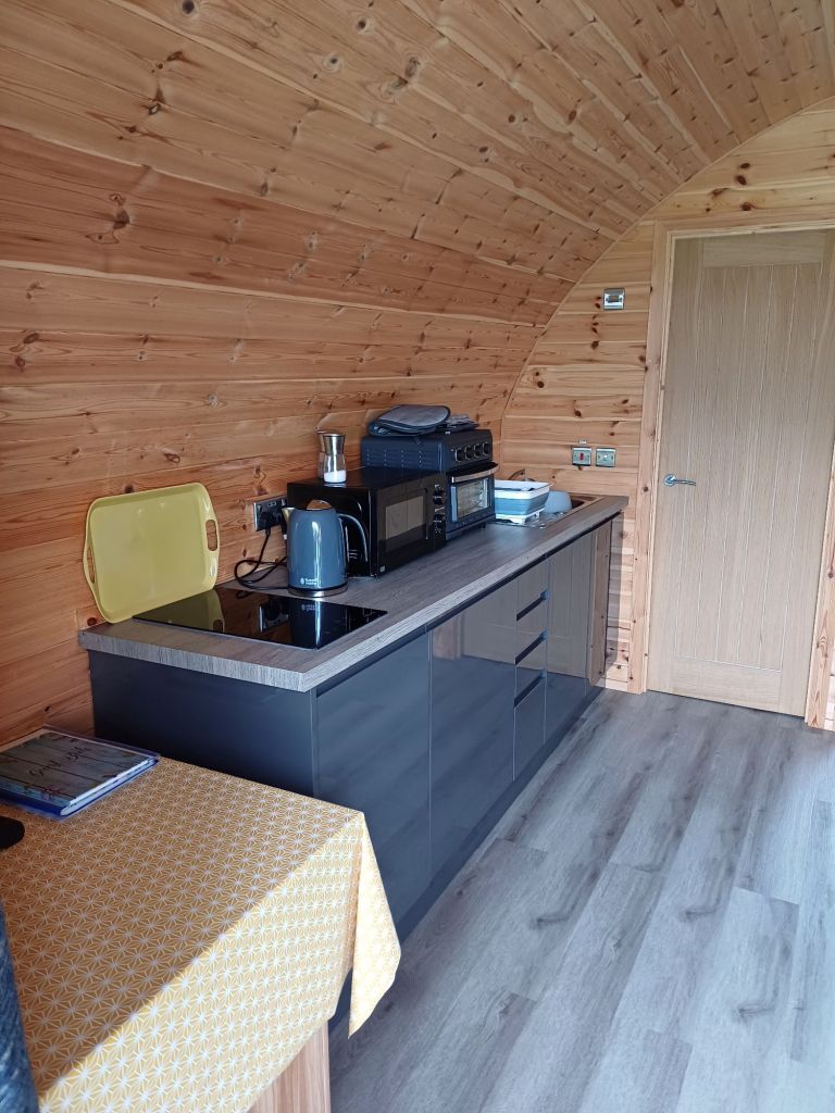 The pod itself has everything one needs and is a charming little wooden cocoon tucked away in a corner of this idyllic landscape. With its curved roof and warm wooden exterior, it looked like something out of a storybook. Stepping inside, we were greeted by a space that was small but perfectly formed in a way. Furnished tastefully with all the essentials and necessities: a plush bed, soft lighting, and enough space to move around without feeling cramped. The bed was inviting enough to make you want to crawl in immediately, while the little thoughtful touches like snacks and most importantly teabags and milk added a layer of homeliness that made it feel more like a boutique hotel than a simple glamping pod. After settling in, spent the evening enjoying the simple pleasures of glamping life by preparing a light dinner using the kitchenette’s facilities, there’s something so satisfying about cooking in a small, well-equipped space. As the sun began to set, I stepped outside to enjoy the meal on the small deck area.